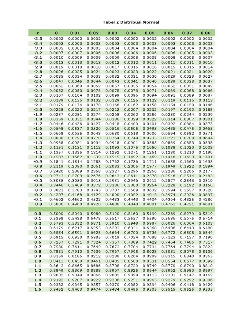(area di bawah kurva normal baku dari 0 sampai z). Gambar kurva distribusi normal baku z. Tabel distribusi normal berisi peluang dari nilai z atau p(z ≤ z). Distribusi normal sendiri merupakan model . Ditarik dari titik nilai z dengan garis tegak di titik nol,.